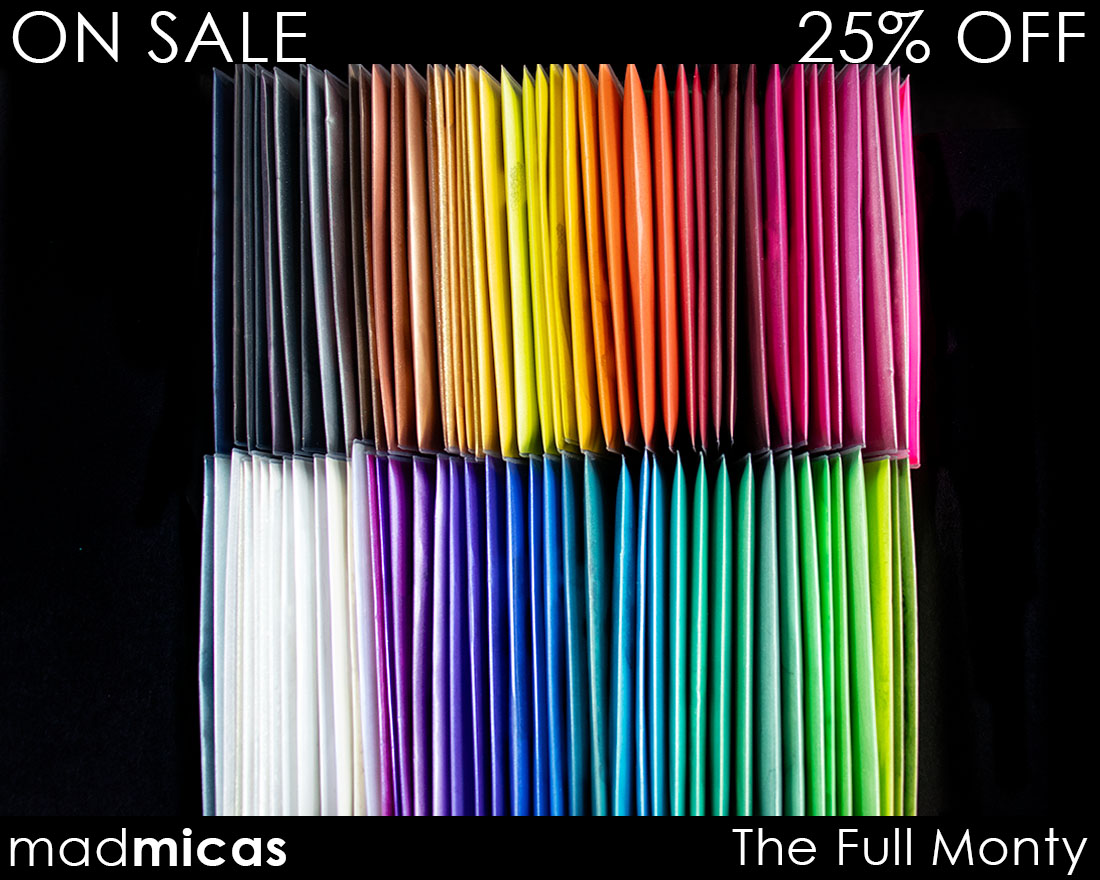 In sample size sets, all colors except for the 6 sparkling micas come in 5-gram bags. Sparkling micas (in bold, below) are offered in 1-teaspoon bags.