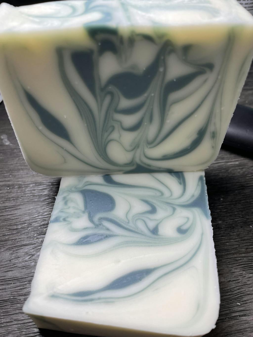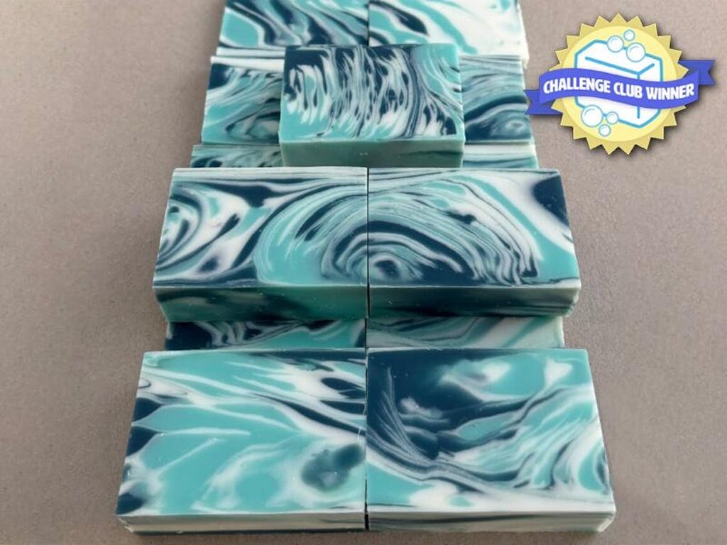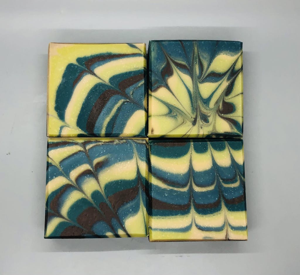I love both Bermuda triangle and sea glass which I both used in this soap and how well they worked together. Both are blue with a hint of green. Madmicas makes it really easy to use their products In CP soap, the colour of the mica will remain vibrant and very close to that of the powder (after oven processing the soap)