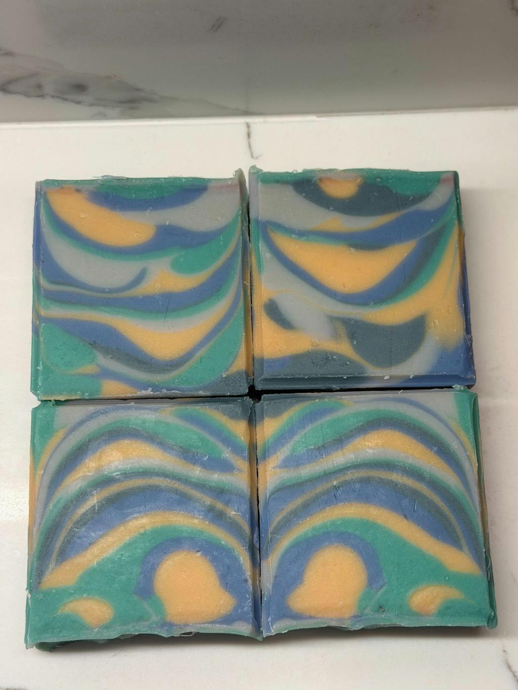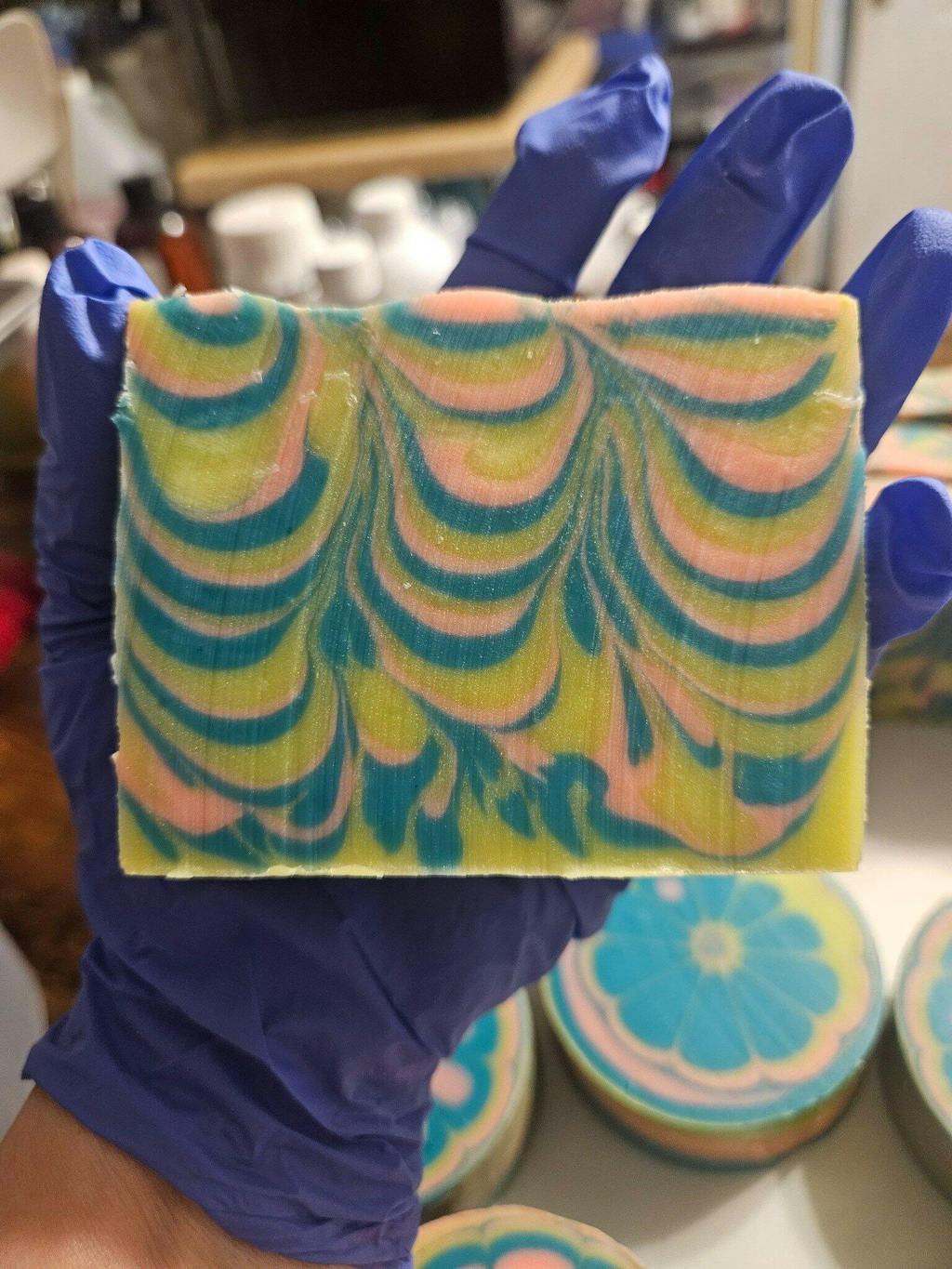 If you don't have this in your soaping arsenal, you are missing out! When I first put it in the oil, I was blown away at how gorgeous it is! I used peach taffy and chartreuse with it and they are all so pretty together