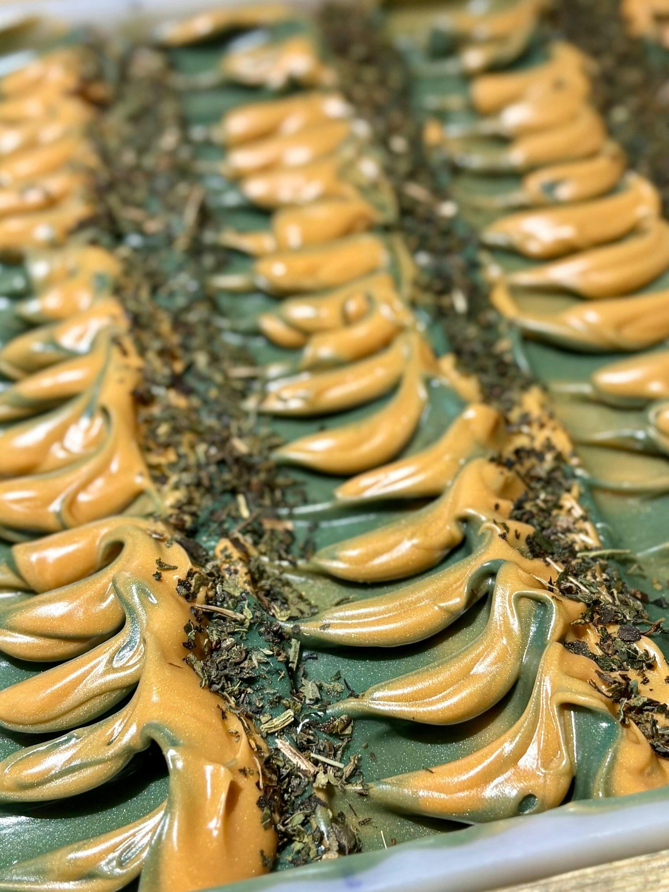 Snake Island mica is a very dark color: dark green with a blue undertone that can shift depending on the oils and/or fragrances used in your soap. In clear MP soap the shimmer remains.